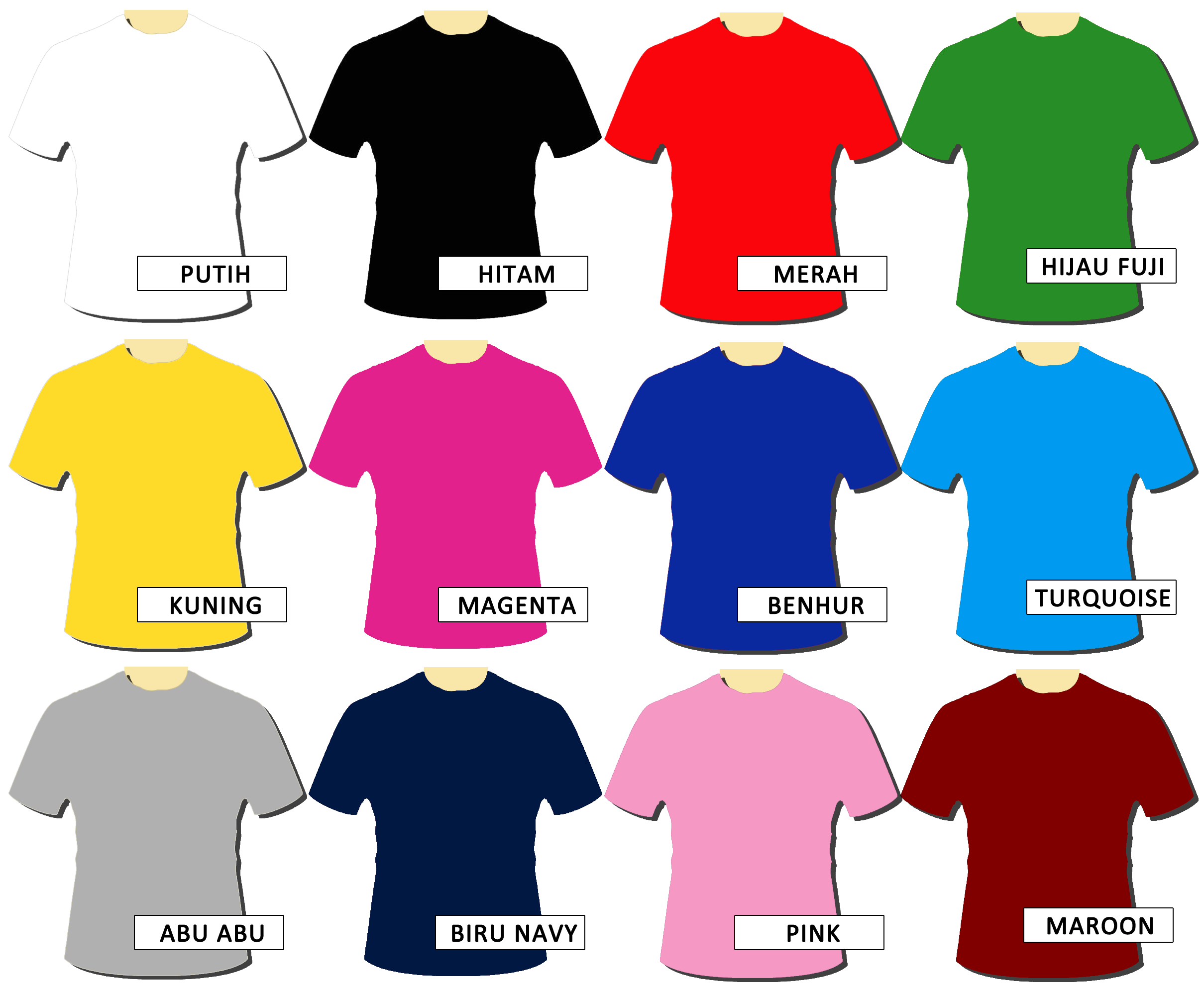 Berikut katalog warna produk kami, terdapat 12 warna, siap menjadi koleksi kaos Anda.